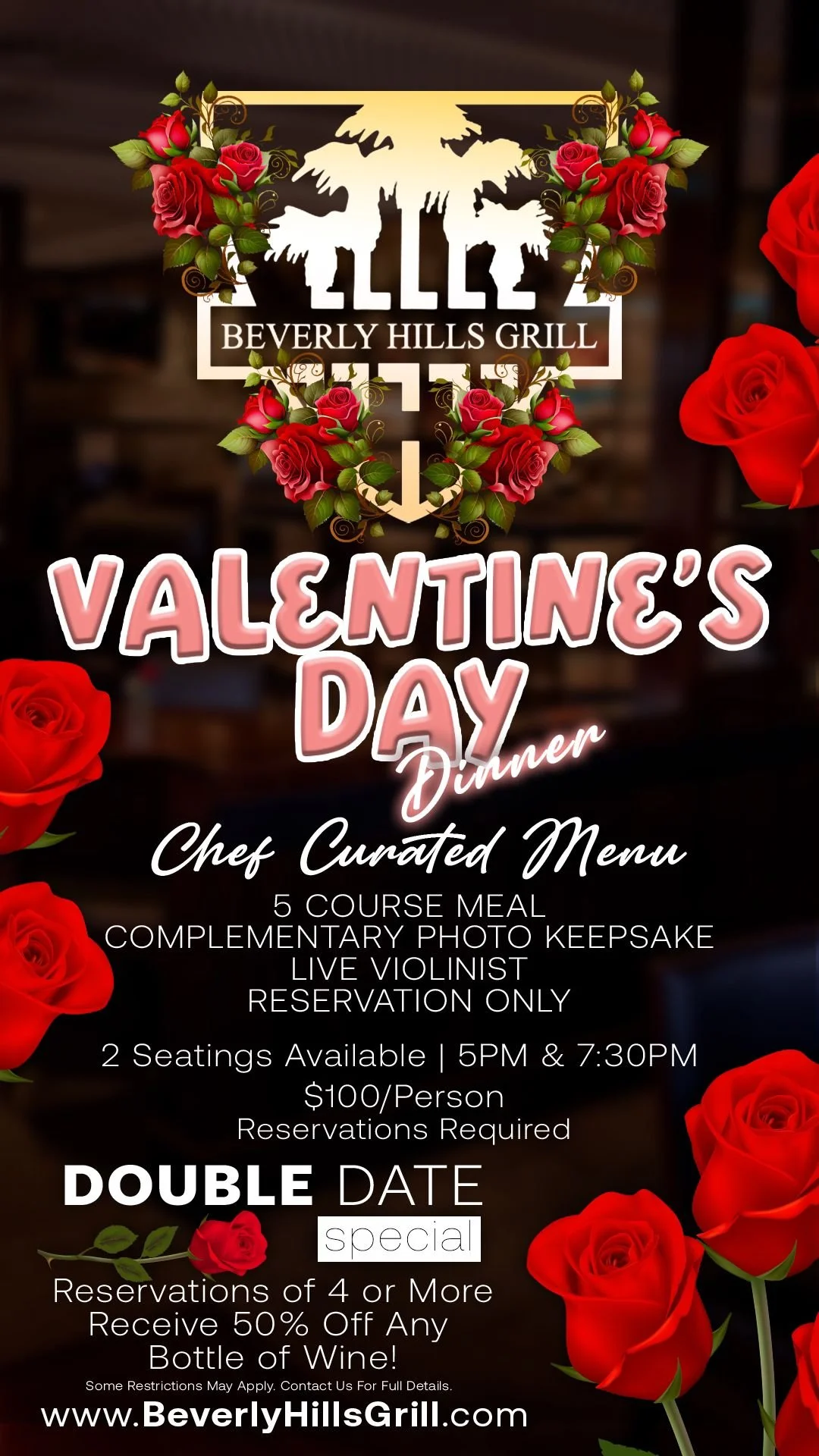Don't wait to secure your spot—this exclusive event is reservation-only with just two seatings available at 5:00 PM and 7:30 PM. Planning a night out with friends? Take advantage of the "Double Date Special" by reserving a table for four or more to receive 50% off any bottle of wine! Visit BeverlyHillsGrill.com today to ensure your Valentine’s celebration is nothing short of spectacular.